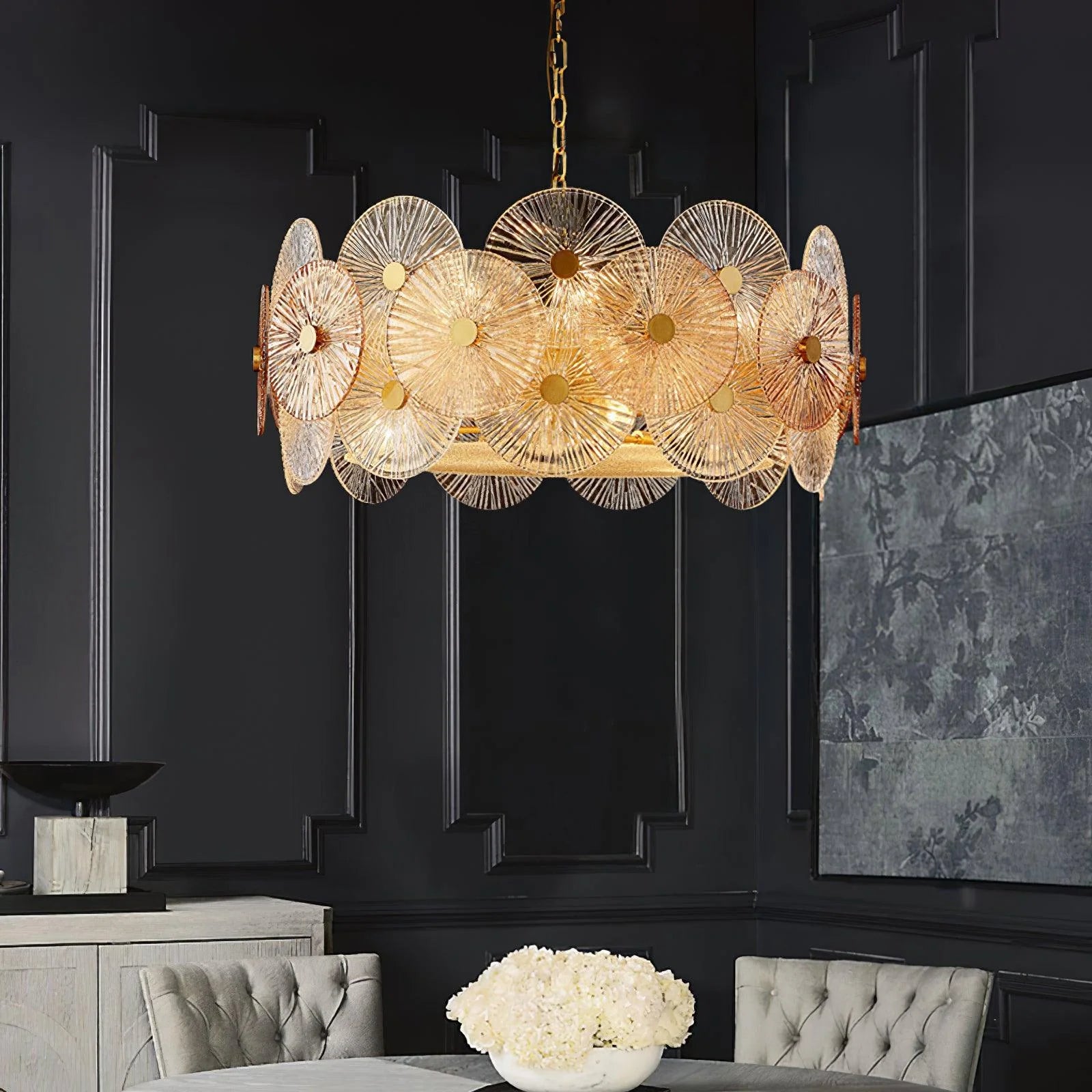 The Postmodern Glass Chandelier features multiple hand-blown glass shades arranged in an artistic, asymmetrical design. Its minimalist metal frame and clear glass elements provide a modern yet elegant lighting solution, perfect for living rooms, dining areas, or entryways.