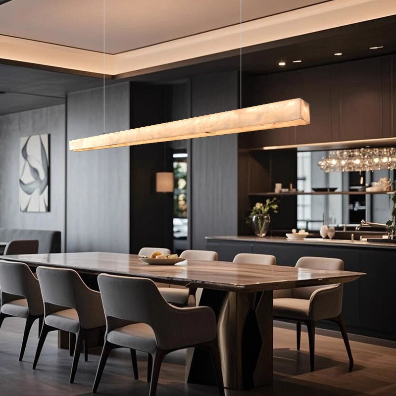 This linear chandelier features a clean, elongated form paired with snowflake stone, creating a calm and understated presence in modern interiors. The natural stone surface shows subtle variations in texture and tone, giving each piece a quiet sense of individuality.