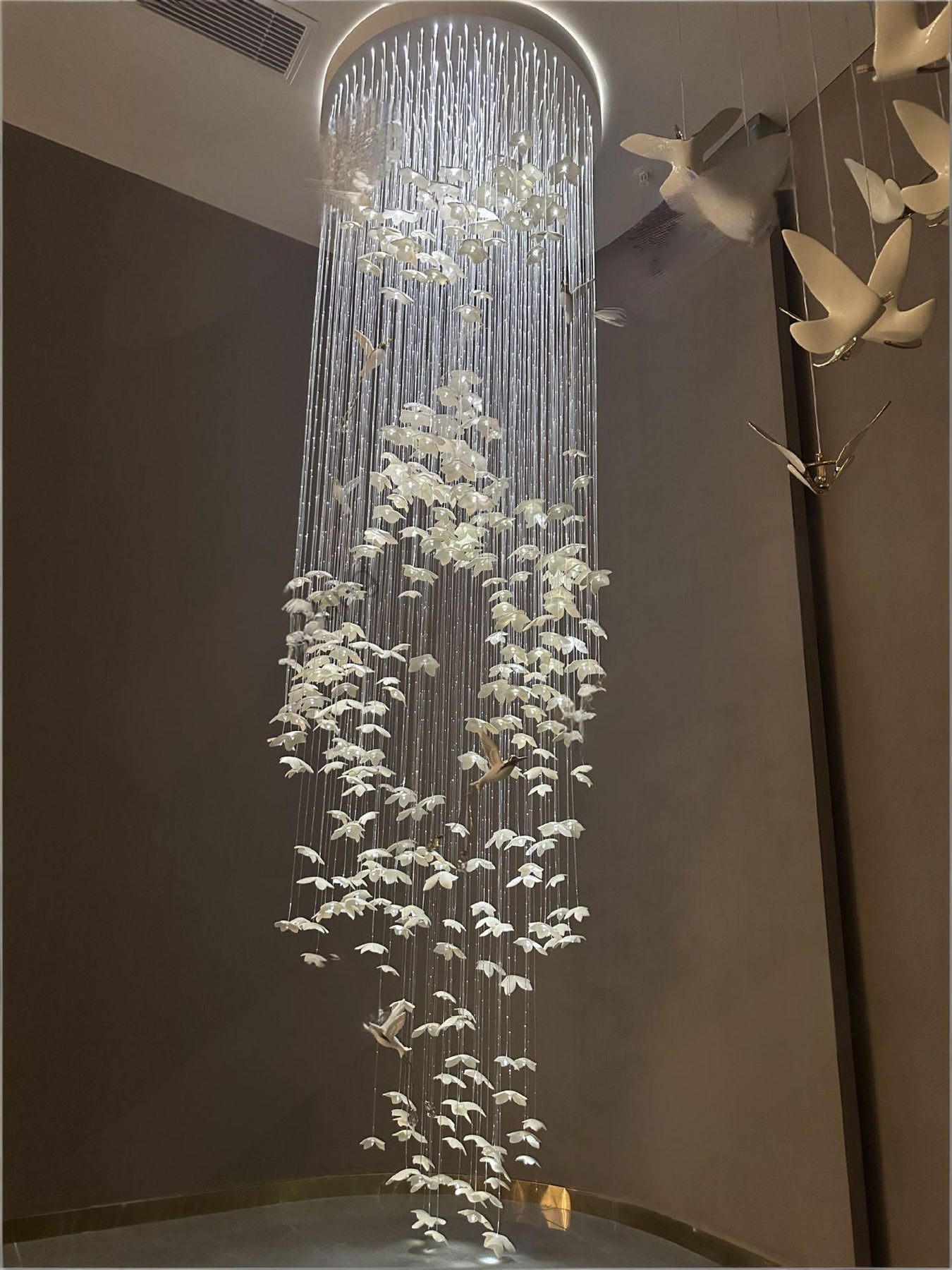 The Flora Bird Stair Chandelier is designed for stairwells and multi-level spaces, providing layered illumination with a balanced and well-proportioned structure. Its clean, sculptural form suits both modern and classical interiors, making it appropriate for entryways, staircases, and open vertical areas where soft, ambient lighting is needed.