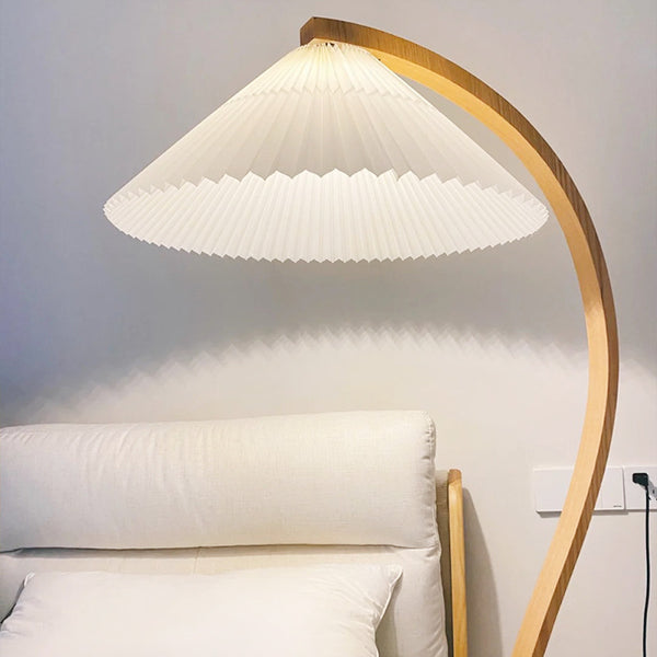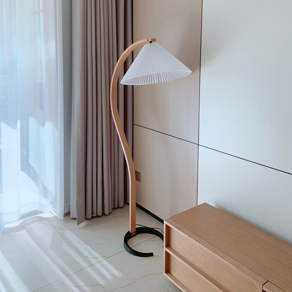 Composé de trois éléments distinctifs, le lampadaire Caprani intègre divers matériaux naturels. Un abat-jour en toile plissée est monté sur une colonne vertébrale incurvée en placage moulé, soutenue et stabilisée par une base en fonte en forme de croissant. Cette lampe est à la fois fantaisiste et élégante, mettant en valeur une juxtaposition de formes et de matériaux. Des lignes nettes et épurées contrastent avec les courbes de la colonne vertébrale, tandis que les couleurs claires et naturelles trouvent une parfaite harmonie au sein de la base noire. L'apparence de la lampe est légère et semble presque pouvoir basculer ou s'envoler à tout moment, mais le poids de la base en fonte assure la stabilité.
