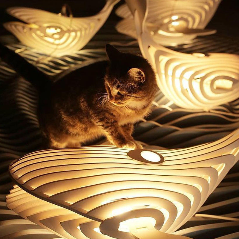 De Japanese Whales hanglamp heeft een glad afgewerkt houten oppervlak dat de natuurlijke nerf, kleur en textuur van het hout benadrukt. Dit vakmanschap versterkt niet alleen de esthetische aantrekkingskracht, maar brengt ook een warm, organisch element in elk interieur, waardoor het een verfijnde keuze is voor een verfijnd verlichtingsontwerp.