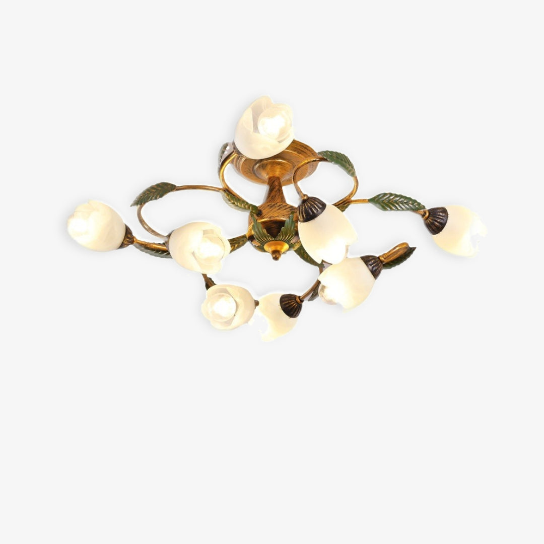 Verfraai uw leefruimte met de American Style Flower plafondlamp, een prachtige mix van moderne vintage charme en elegant glasvakmanschap. Het delicate bloemenmotief voegt een tijdloze touch toe, terwijl de glazen elementen een warme, uitnodigende gloed uitstralen die een gezellige en verfijnde sfeer creëert. De lamp heeft een vintage-geïnspireerd koperen ijzeren frame, afgewerkt met een antieke koperen verftechniek, wat duurzaamheid garandeert door meerdere smeedprocessen die roest en corrosie tegengaan. Deze combinatie van schoonheid en stevigheid maakt het een ideale verlichtingskeuze om elke kamer te verrijken met blijvende stijl en comfort.
