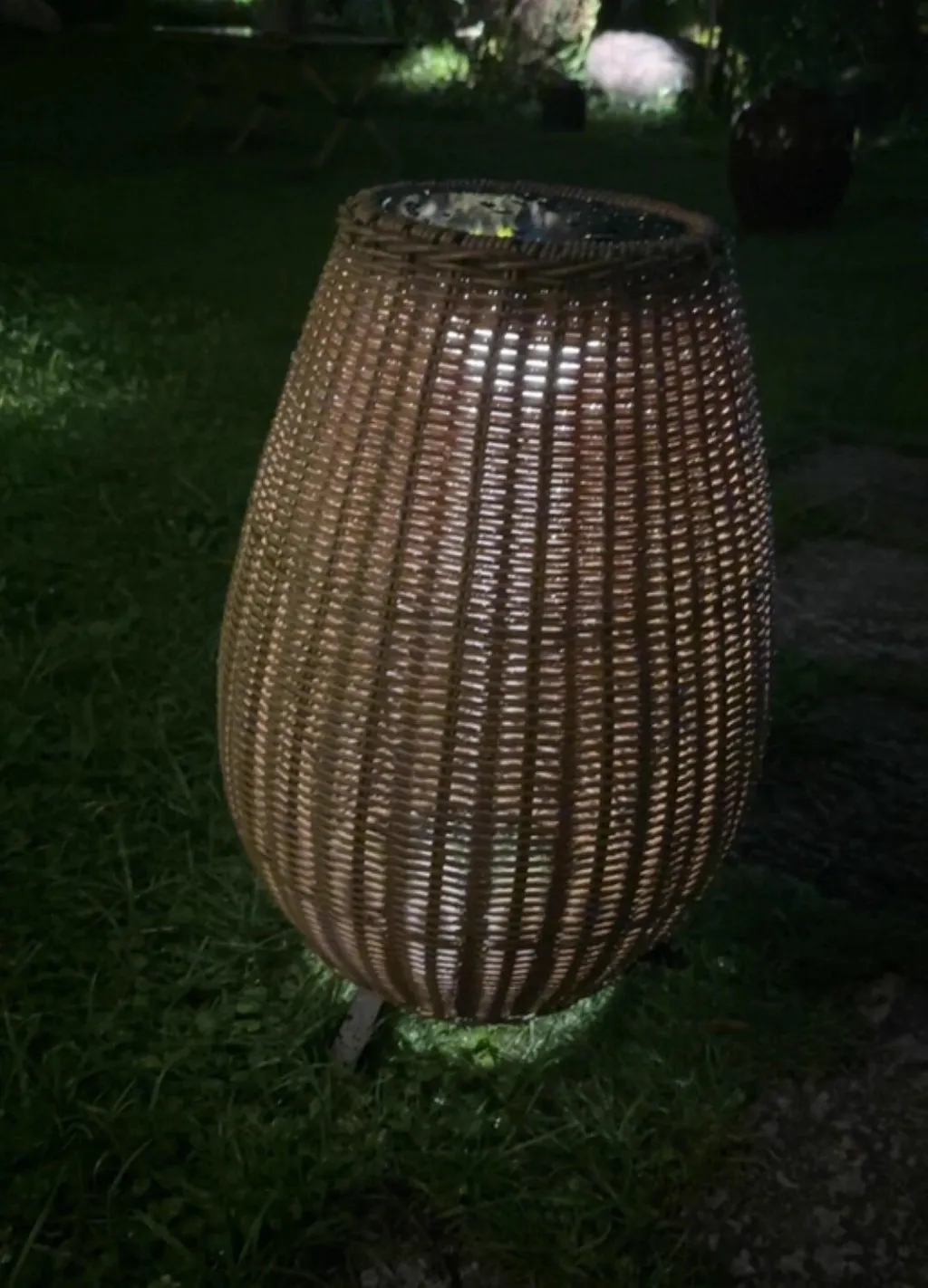 Love how the lamp glows after dusk — the pattern of the rattan creates nice shadows, really elevating our deck area.