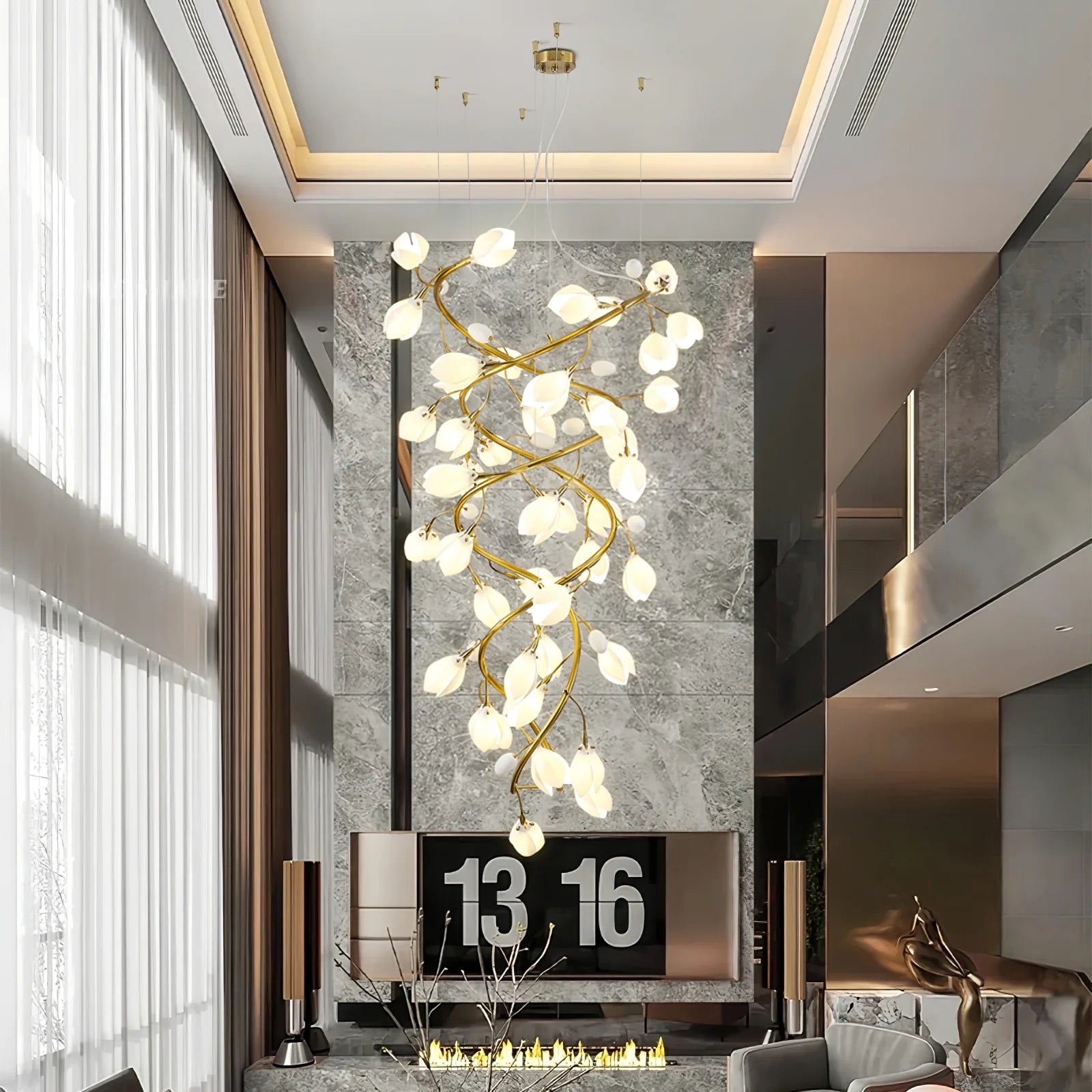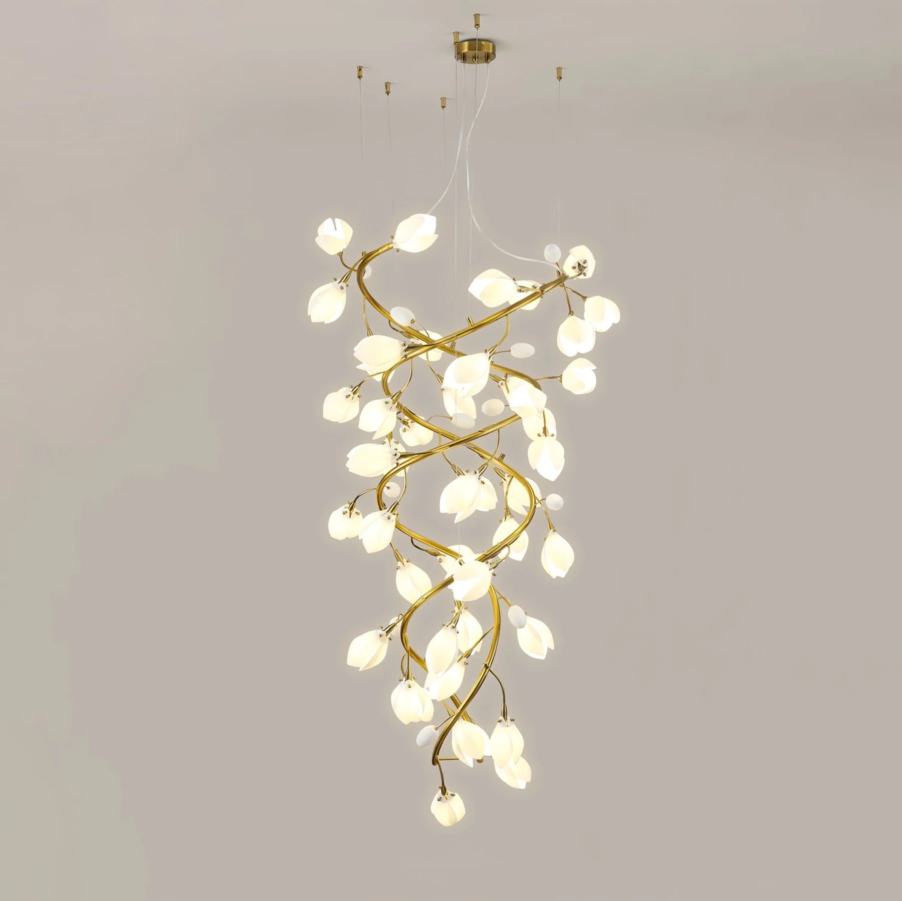 Crafted from premium ceramic, the Lysandra Flower staircase chandelier features a meticulously designed magnolia blossom lampshade. Its vibrant color, refined texture, and smooth, rounded finish enhance both its aesthetic appeal and durability, making it an elegant lighting choice for sophisticated interiors.